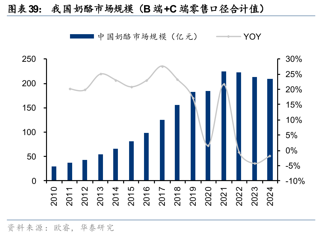 规模:据欧睿,24年中国奶酪行业市场规模超200亿元,C端市场规模于25Q1降速放缓,B端产品应用场景增加、带来行业增量机会。据欧睿数据,24年中国奶酪市场规模达209亿元,16-21年受益于消费结构升级及公众健康意识提升,我国奶酪市场快速成长(期间CAGR达17.9%),但受消费力偏弱、以奶酪棒为代表的儿童即食类产品陷入景气下行周期等因素影响,22-24年我国奶酪市场规模阶段性承压。据妙可蓝多24FY&25Q1业绩说明会,25Q1我国零售端奶酪行业市场规模同比-5%/环比 2%,行业降速已经有所放缓。与此同时,22年起,餐饮工业奶酪产品的需求量持续增长,B端奶酪在奶酪大盘中的销量占比于24年提升至70%,带来行业增量机会。