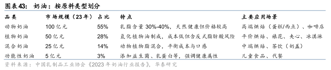 规模:23年中国奶油行业市场规模达180亿元,在烘焙、茶饮等餐饮需求驱动下持续增长,产品结构呈现以动物奶油为主导、植物奶油与混合奶油差异化并存的格局,健康化与功能化趋势逐步显现。据中国乳制品工业协会《2023年奶油行业报告》,23年中国奶油行业市场规模约180亿元,近5年CAGR为8.5%,主要系受益于烘焙、茶饮等餐饮场景的快速扩张,预计25年市场规模或将突破220亿元。按原料类型划分来看,动物奶油23年市场规模约100亿元(占比55%),乳脂含量通常在30%-40%,常用于高端烘焙店、咖啡店中;植物奶油23年市场规模约50亿元(占比28%),在打发速度和定型持久性上,显著优于动物奶油,成本较低,多用于平价烘焙、裱花、夹心、冰激淋的生产中;混合奶油23年市场规模约25亿元(占比14%),采用动物植物脂混合,平衡成本与口感,主要用于中端烘焙、茶饮店中;此外还有少量功能性奶油,添加益生菌、乳蛋白等,强调健康属性。据欧睿数据,过去几年我国B端奶油行业市场规模增速中枢~15%,具备成长性。