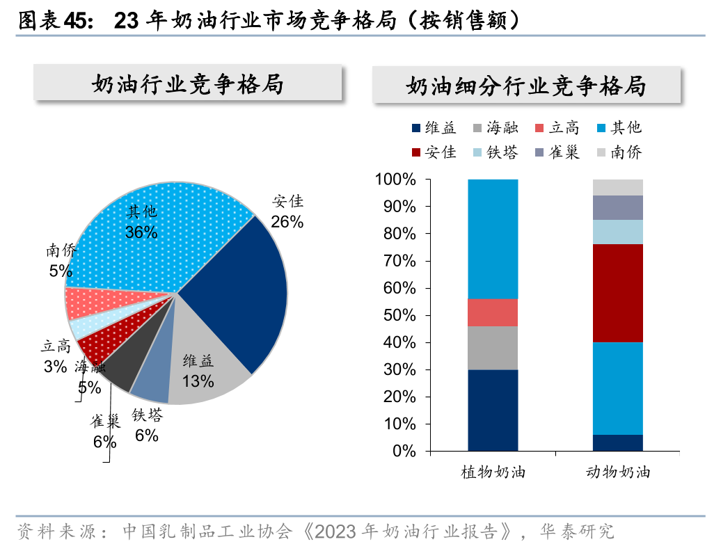 格局:动物奶油格局稳固、外资品牌份额过半,此前国产奶油品牌主要发力植物奶油,现在也在致力于动物奶油的生产和研发工作。据中国乳制品工业协会《2023年奶油行业报告》,23年我国奶油行业中,安佳/维益/铁塔/雀巢位列前四,市占率分别为26%/13%/6%/6%,国产奶油品牌海融、立高、南侨紧随其后,市占率均≤5%。细分品类来看,动物奶油格局相对稳固,外资品牌份额过半,安佳占据领先地位、23年市占率为36%;植物奶油格局相对分散,维益/海融/立高23年市占率分别为30%/16%/10%。此前国产奶油品牌主要发力植物奶油,23年5月中立高率先推出360pro稀奶油产品,24年销售额表现亮眼。24年局部区域的冲突(尤其是红海区域)使得进口稀奶油产品的海运费高企,安佳等热门稀奶油产品在国内出现了涨价、断货等异常情况,在此背景下,国产稀奶油逐渐进入下游客户的视野,目前行业内有更多的国产奶油厂商加大对于动物奶油的生产和研发,既包括立高、海融、青岛可颂这样的专业奶油生产商,也包括伊利等综合乳制品生产商,国产稀奶油的发展有望提速。