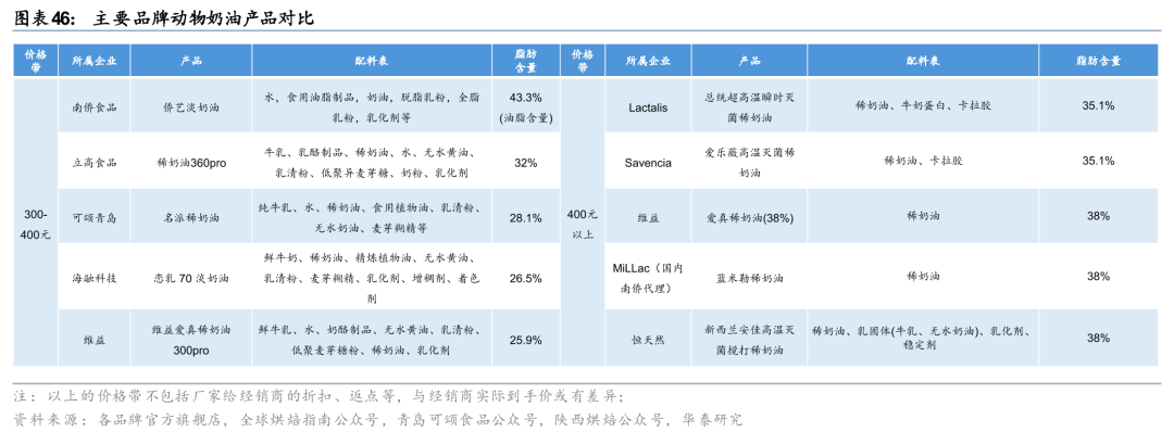 动物奶油作为高端乳脂产品,竞争力的核心在于奶源品质与工艺技术,而产品稳定性与操作便捷性直接决定了品牌在下游B端客户的渗透能力。动物奶油定位偏高端,由牛奶经过离心机脱水制成,不同品牌产品稳定性、操作简易性的差别较大,因此产品力的重要性凸显,产品力背后、比拼的是奶源/稳定性/操作简便性等。恒天然本身具备奶源优势,安佳在产品稳定性与操作简便性上都有明显的优势。我们将国产稀奶油产品与进口稀奶油产品的配料表、脂肪含量等进行对比,可以发现国产稀奶油通常会加入添加剂、来保证产品稳定性和操作简便性,乳脂含量较低,口味弱于进口稀奶油产品,因此多用于夹心等。尽管国产奶油在乳脂含量、添加剂使用及风味表现上与进口产品存在客观差距,但近年来国内企业通过引进先进设备、优化发酵工艺(如低温杀菌技术)已显著提升产品品质,逐步缩小技术代差。