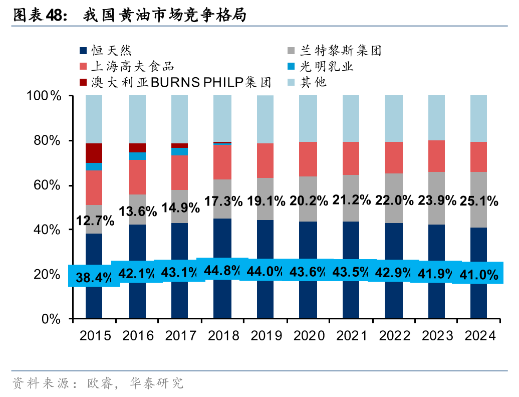 格局:国际乳制品巨头主导高端市场,国产品牌逐渐崛起。据欧睿,24年恒天然(安佳)在中国黄油市场中的市占率达41.0%,主打烘焙及餐饮渠道,兰特黎斯集团(总统)亦在布局高端黄油和发酵黄油等产品,24年在中国黄油市场中的市占率为25.1%。近年来,我国黄油行业内呈现出国产品牌崛起的趋势,光明乳业的黄油产品主打性价比,主攻家庭烘焙和工业客户,妙可蓝多亦通过低温发酵工艺切入中高端黄油市场,贡献收入增量,区域型乳企新疆西域春依托本地的奶源优势,在西北黄油市场有所布局。
