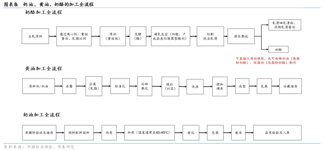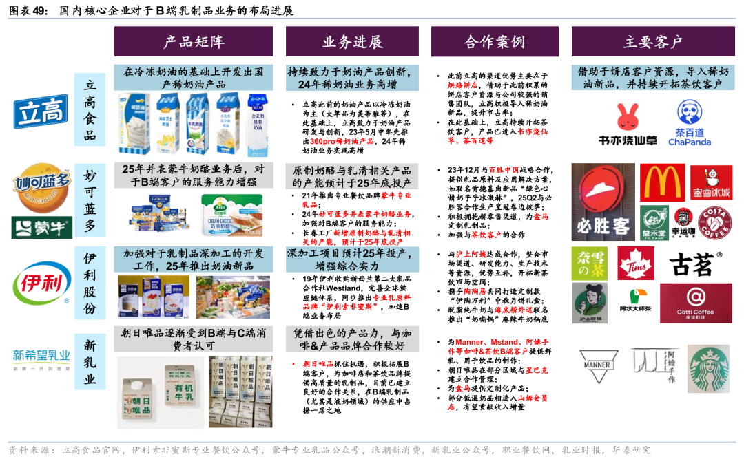 当前中国乳企均在加速布局B端乳制品与深加工市场,积极拥抱产业新周期。立高食品率先推出国产稀奶油产品,并凭借显著的质价比优势,将下游客户由烘焙饼店拓展至部分茶饮客户;妙可蓝多24年实现对于蒙牛奶酪业务的并表后,不断夯实供应链壁垒,对于B端客户的服务能力显著提升;伊利股份作为综合性乳企龙头,奶油/奶酪等深加工产能于25年投产,凭借品牌背书,已和部分优质客户实现对接。