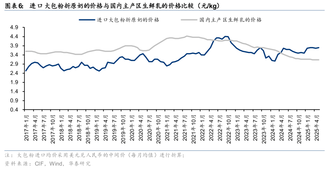2)原奶成本优势:短周期内国内外奶价的联动呈现趋势减弱,当前我国原奶价格及大包粉价格均处于相对低位。23年以来,国内生鲜乳过剩情况显著,供过于求使得我国原奶价格处于相对低位,而此阶段新西兰乳品价格指数等未见明显的下行,短周期内国内外奶价的联动呈现趋势减弱。我们对比进口大包粉折原奶的价格与国内主产区生鲜乳的价格发现,自24年4月以来,国内奶价更有优势,为国内乳品的国产替代趋势创造条件。