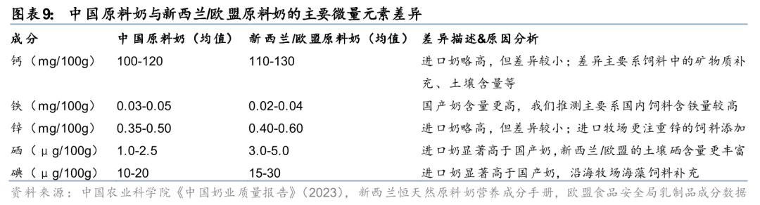 我们从主要微量元素的角度分析中国原料奶与新西兰/欧盟原料奶的差异,可以发现硒元素和碘元素、进口奶显著高于国产奶,主因土壤和饲料差异,钙元素和锌元素、进口奶略高但差异较小,可以通过饲料调整弥补。近年来,国产头部乳企通过收购规模化牧场以提升奶源品质,乳脂、乳蛋白指标已接近进口水平,但中小乳企仍受限于饲料成本(优质苜蓿草依赖进口,微量元素波动较大)和管理经验,奶源稳定性与进口乳企相比仍有差距。