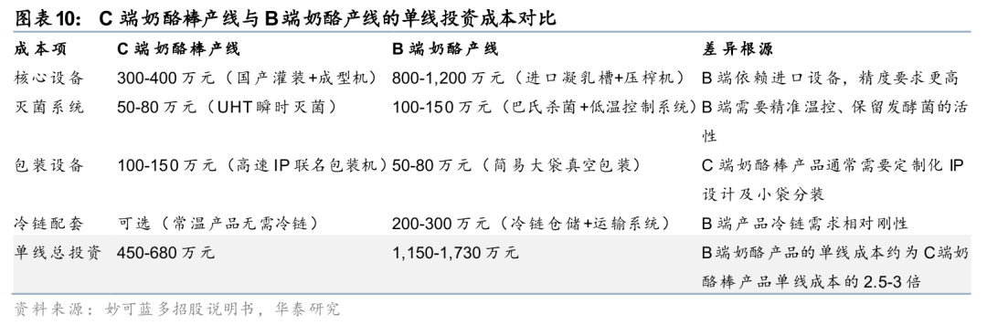 奶酪棒品类的生产设备已基本实现国产化,但B端乳制品精度要求更高、依赖进口设备;从单线投资成本对比来看,B端奶酪产品的单线投资成本约为C端奶酪棒产品单线成本的2.5-3倍。我们认为此前奶酪棒放量的原因之一在于国内的奶酪企业已实现了生产线的国产替代,使得行业进入门槛大幅降低,进口奶酪生产线成本为2,000万元(产能在每小时3.75-7.50万支),而国产化后的生产线成本为300-500万元(产能在每小时7,500-9,000支)。从工艺上看,奶酪棒产品在生产加工的过程中加入了明胶等凝固剂,定型后插棒,整体精度要求不高;但B端乳制品精度要求更高、主要企业对于进口设备的依赖程度更高,我们认为短期内国产化的难度较高。我们综合考虑核心设备、灭菌系统、包装设备、冷链配套等,B端奶酪产品的单线投资成本约为C端奶酪棒产品单线成本的2.5-3倍。