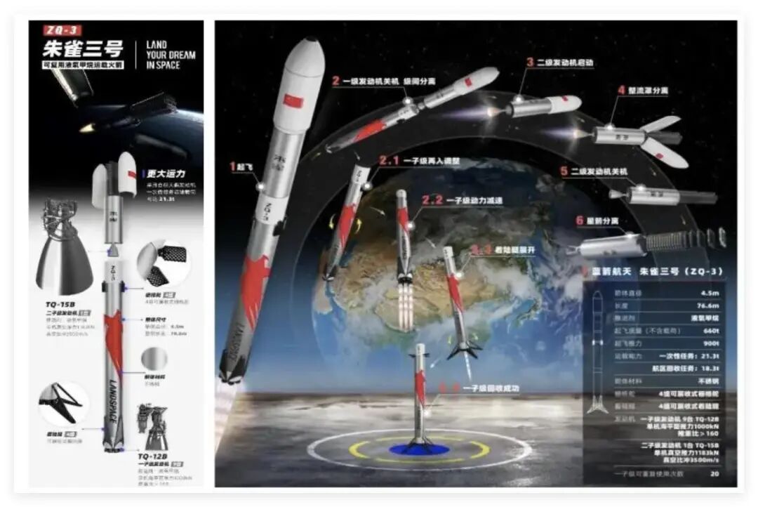蓝箭航天朱雀三号火箭介绍及可回收示意图: