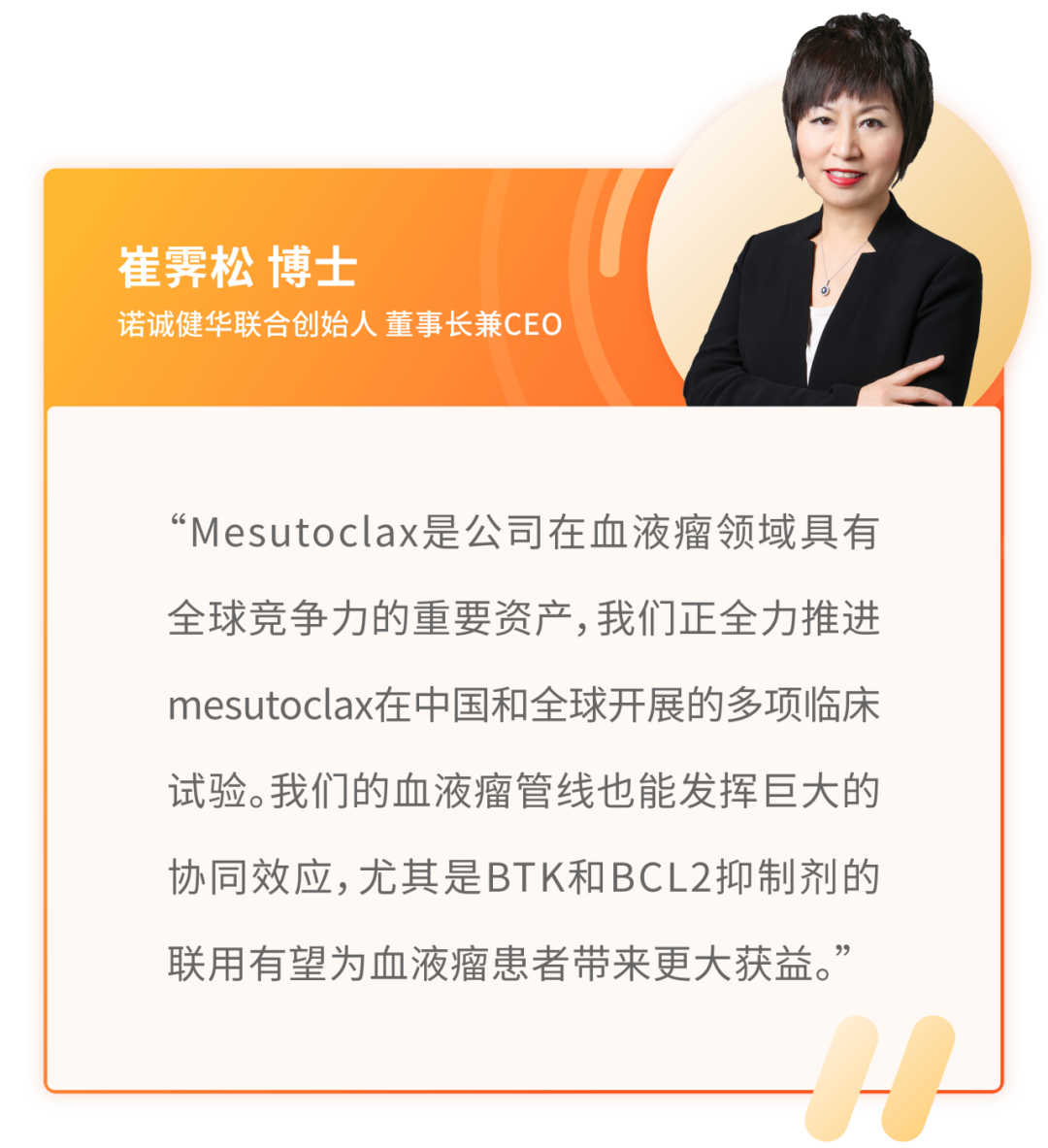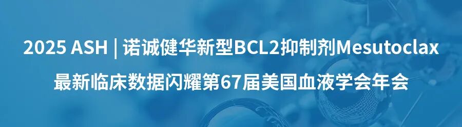 2025年12月,mesutoclax多项研究在第67届美国血液学会(ASH)年会上进行了公布。Mesutoclax单药治疗或联合奥布替尼治疗CLL/SLL显示出良好的疗效和安全性。无论在初治CLL/SLL还是复发/难治性 CLL/SLL(含既往BTK抑制剂治疗失败)患者中,125毫克mesutoclax剂量组的ORR均为100%。联合奥布替尼治疗36周时,外周血不可检测微小残留病灶(uMRD)率为65%。