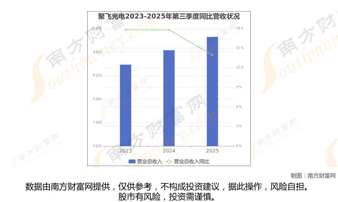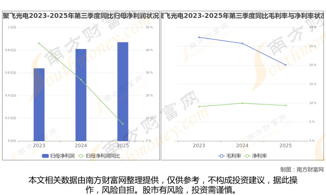 2025年第三季度季报显示,聚飞光电公司毛利率20.09%,净利率9.36%,归属净利润8681.42万,同比增长7.47%。