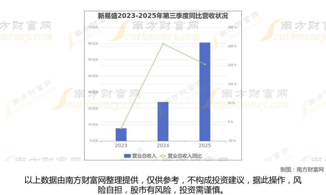 新易盛披露了2025年第三季度财报。报告显示(如上图),新易盛2025年第三季度实现营收60.68亿元,同比152.53%。