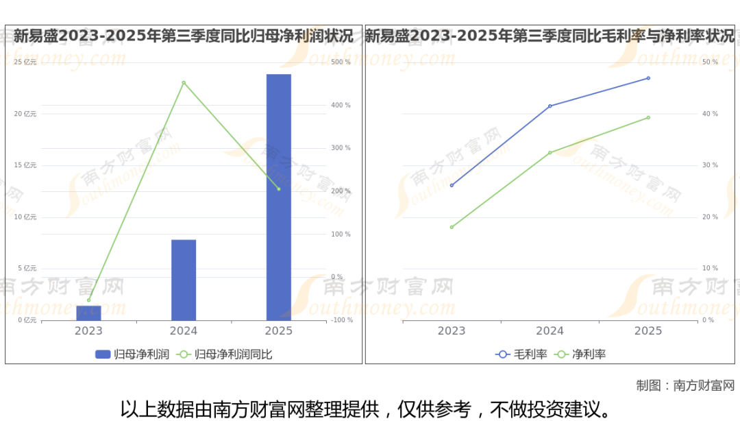 新易盛2025年第三季度季报显示,公司实现净利润23.85亿,同比增长205.38%;毛利润为28.48亿,毛利率46.94%。