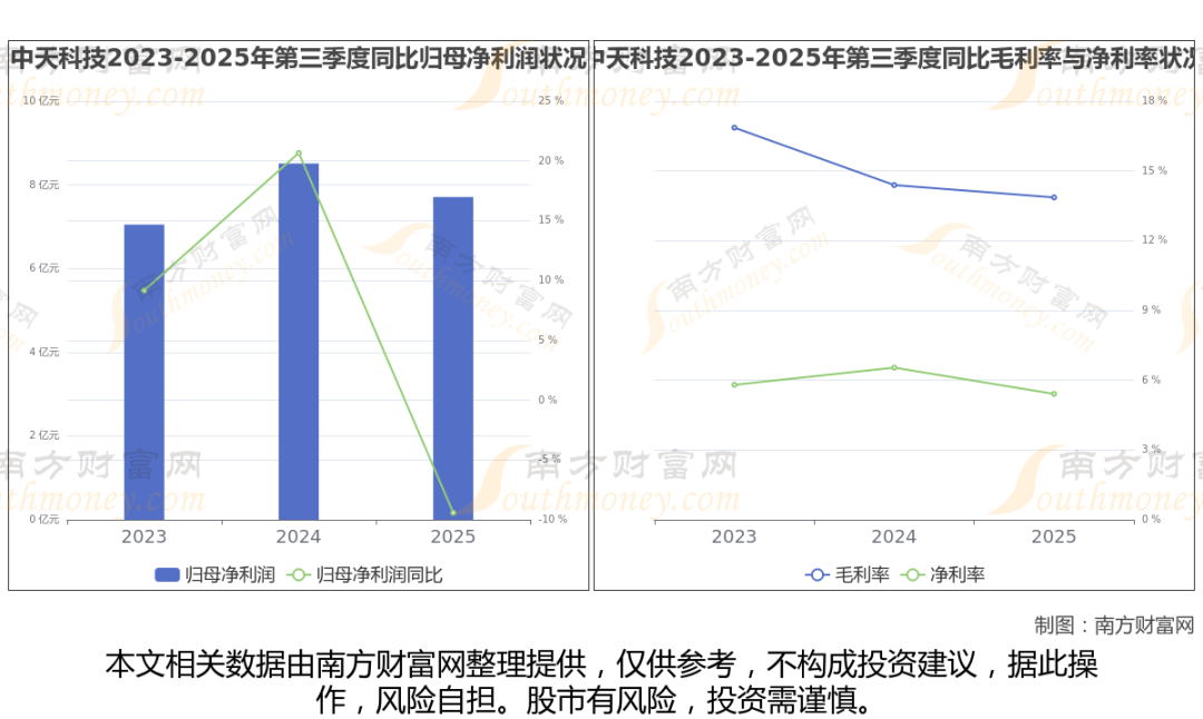 2025年第三季度季报显示,中天科技公司实现净利润7.71亿,同比上年增长率为-9.42%,毛利率13.86%。