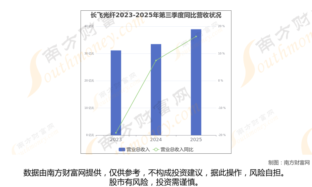 长飞光纤2025年第三季度报告显示(如上图),公司实现主营业务收入38.91亿元,较去年同期增长16.27%。