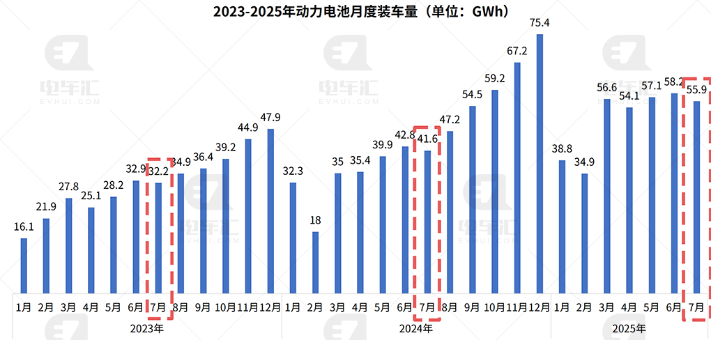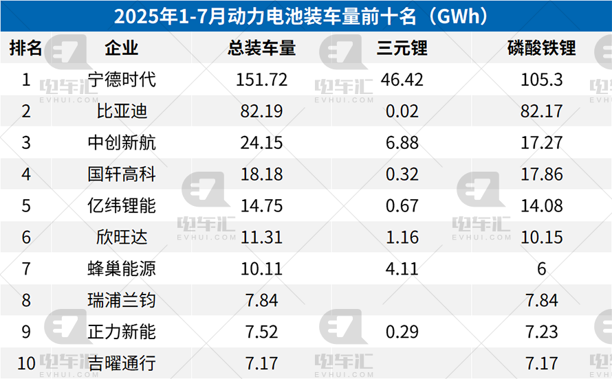 2023-2025年动力电池月度装车量(单位:GWh)根据最新数据,2025年7月我国动力电池装车量达55.9GWh,较6月(58.2GWh)环比下降4%,但同比2024年7月(41.6GWh)增长34.4%,延续了高速增长态势。这一增长主要得益于新能源汽车渗透率的提升及储能市场的快速扩张。从7月份企业装车量来看,头部企业市场格局依旧稳固,但第二梯队座次出现微妙变化。宁德时代23.11GWh,市占率41.4%,环比下滑2.28个百分点;比亚迪11.83GWh(21.2%),环比微降0.29个百分点;中创新航4.69GWh(8.4%),环比提升0.84个百分点,为当月增幅最大企业;4到6名中,国轩高科2.7GWh(4.8%)、亿纬锂能2.54GWh(4.6%)、欣旺达2.24GWh(4.0%)。蜂巢能源、正力新能、瑞浦兰钧、吉曜通行分列第七至第十位,单月装车1.7GWh–1.05GWh不等。值得注意的是,蜂巢能源、正力新能、欣旺达三家7月市占率环比提升均超过0.2个百分点,显示第二梯队竞争激烈,“贴身肉搏”已成常态。1–7月累计装车量方面,宁德时代、比亚迪断层领先。其中宁德时代151.72GWh,市占率39.0%,其中磷酸铁锂105.3GWh、三元锂46.42GWh,双线并举;比亚迪82.19GWh,市占率21.1%,几乎全部为磷酸铁锂,刀片电池路线持续放量。中创新航24.15GWh,稳居第三,磷酸铁锂贡献71.5%;国轩高科、亿纬锂能、欣旺达、蜂巢能源、瑞浦兰钧、正力新能、吉曜通行依次排名四至十位,十强合计市占率已达96.7%,行业集中度高企。从目前的情况来看,“宁王”地位短期难撼,但市占率已出现松动,第二梯队有望继续蚕食高端三元份额;比亚迪刀片电池外供节奏决定其市占率天花板,2025年下半年或将有多家车企新车型切换比亚迪电池。中创新航、亿纬锂能、欣旺达在储能 动力双轮驱动下,全年装车有望继续冲高。