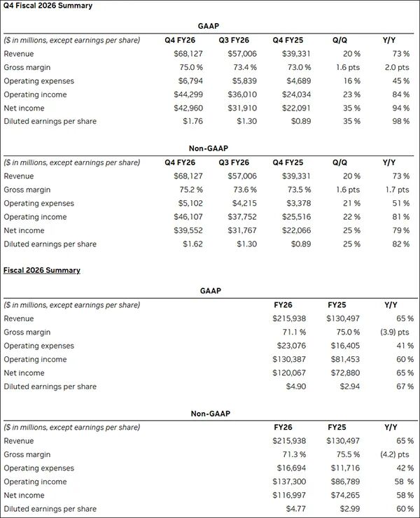 第四季度,英伟达GAAP和非GAAP毛利率分别为75.0%和75.2%;2026财年全年,英伟达GAAP和非GAAP毛利率分别为71.1%和71.3%。