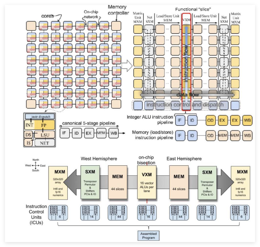 LPU的张量流处理器(TSP)的架构(右图)对比传统GPU采用多核布局(左图):
