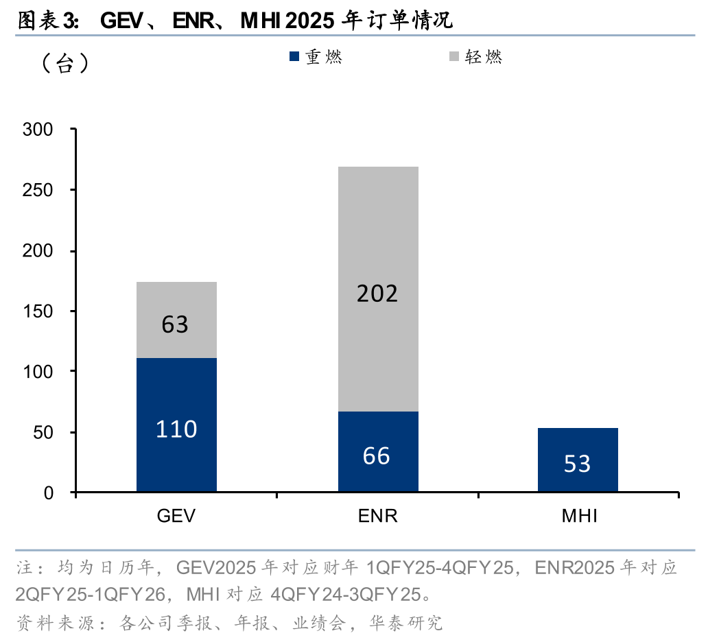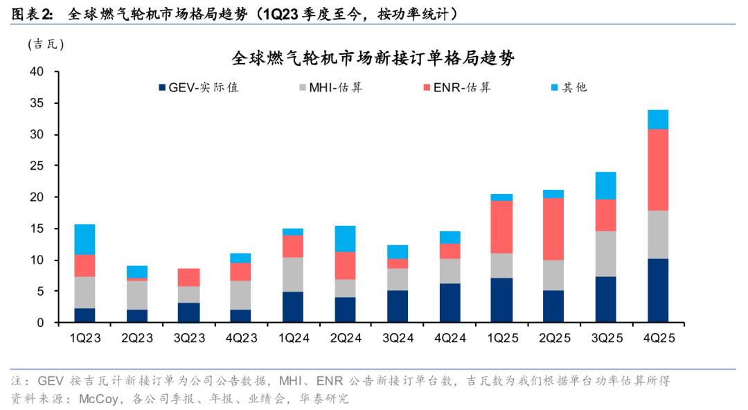 根据McCoy,4Q25全球燃机新签订单34GW,同/环比 134%/ 42%,创十年以来单季度新高(>10MW口径,下同)。2025全年全球燃机新签订单合计100GW,同比 75%,增速同比加快42pct。全球燃机需求共振,2025全年美国市场以159%的同比增速领跑全球,订单占比44%;非美市场亦实现了40%的订单同比增速,其中亚洲、中东等区域订单占比22%、17%。分企业看,三大主机厂商订单高增下有所分化。我们估算GEV、西门子能源、MHI 2025年新增燃机订单30、36、24GW,同比 48%、 197%、 51%,2025年市占率为30%、36%、24%,同比-5、 15、-3pct,得益于均衡的市场布局和完备的产品矩阵,西门子能源2025年实现了市占率大幅增长。