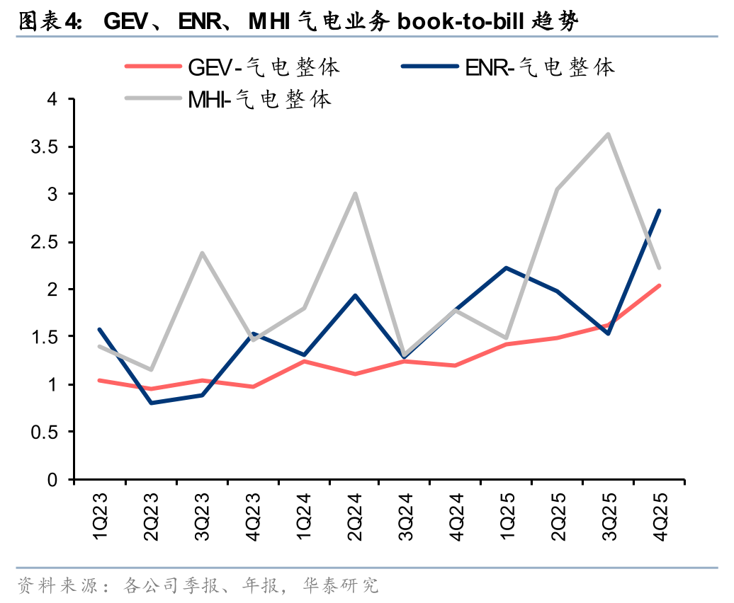 数据中心订单需求持续高增,推动订单销售均价提升。以西门子能源为例,截至25年末公司燃机协议 预定协议合计80GW,其中数据中心贡献25% (22GW),这一占比较3Q25大幅提升9.5pct。得益于需求景气和数据中心直接订单的增长,GEV、西门子能源4Q25实现了经营利润率(GEV披露口径为EBITDA利润率,西门子能源为特殊项前利润率)同比 1.98、2.03 pct的提升,分别达到了16.9%、16.6%;且根据西门子能源Capital Market Day披露,燃机设备、燃机服务在手订单25年利润率相比22年分别增加12、3pct,预示着后续经营利润率表现有望持续加强。
