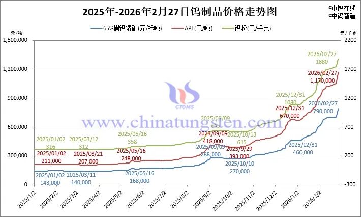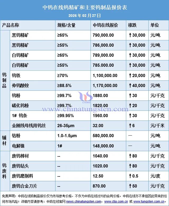春节复工以来快速且强势的钨价拉升行情,导致钨市场投机情绪发酵,整体报价体系出现明显紊乱。散货追高报盘频现,但实际可流通资源有限。持货商惜售待涨意愿强烈,采购商则因成本压力骤增观望情绪浓厚。钨市场整体成交清淡,主要以部分刚需小单及节后补库需求为主,流动性相对有限,产业链博弈加剧。