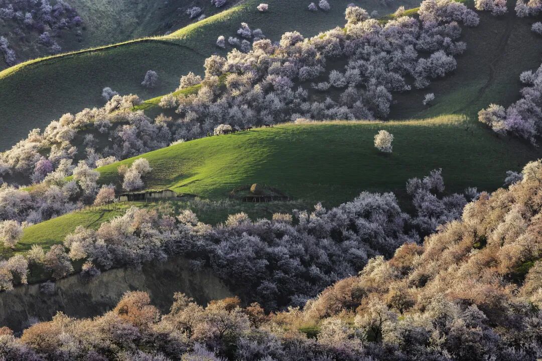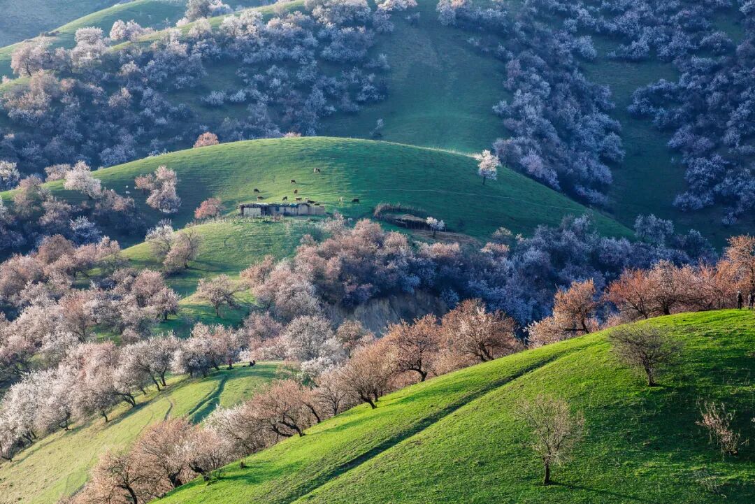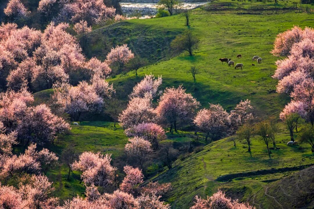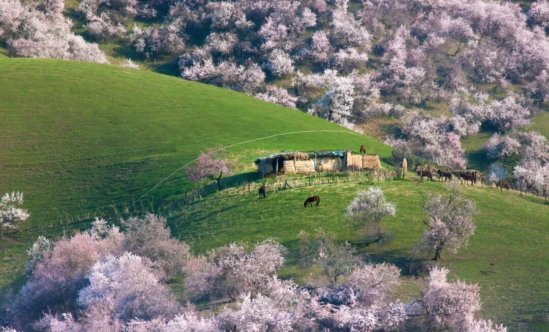 远处的天山山顶还有积雪,近处的草原刚冒出嫩绿的草芽,而杏花就在这冬与春的交界处,开得热热闹闹。风一吹,花瓣纷纷扬扬落下来,落在肩上,落在头发上,落在掌心里——这一刻您就明白了,为什么那么多人,千里迢迢就为来看这一场花。