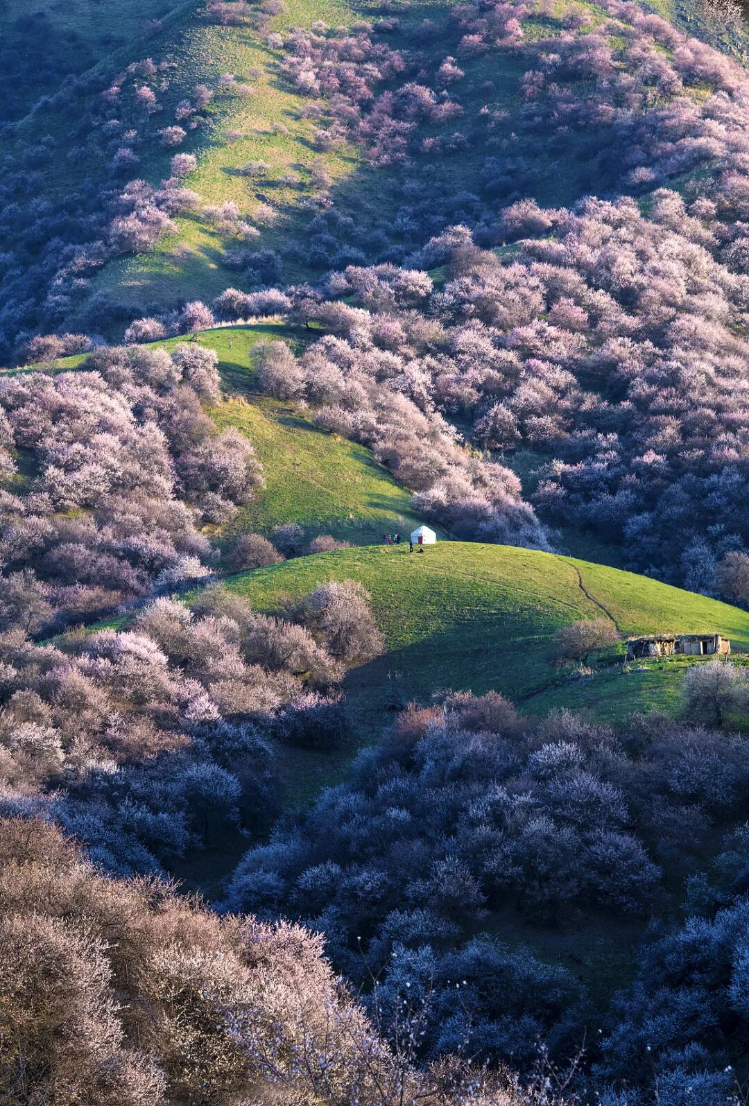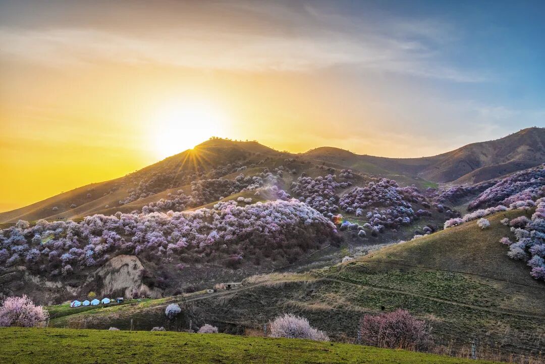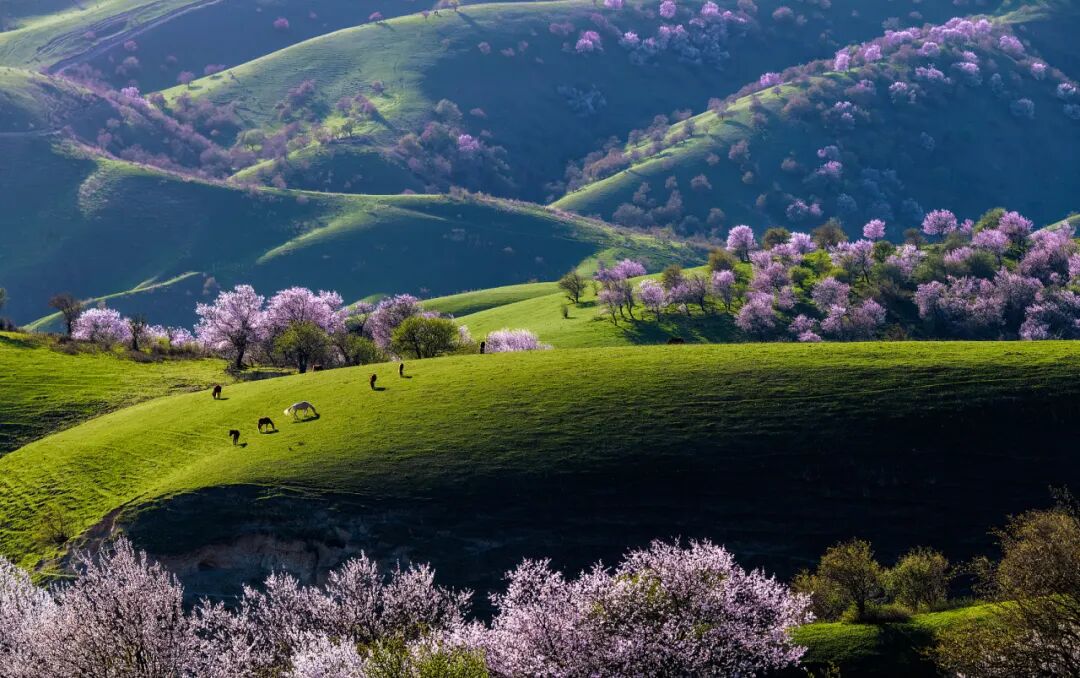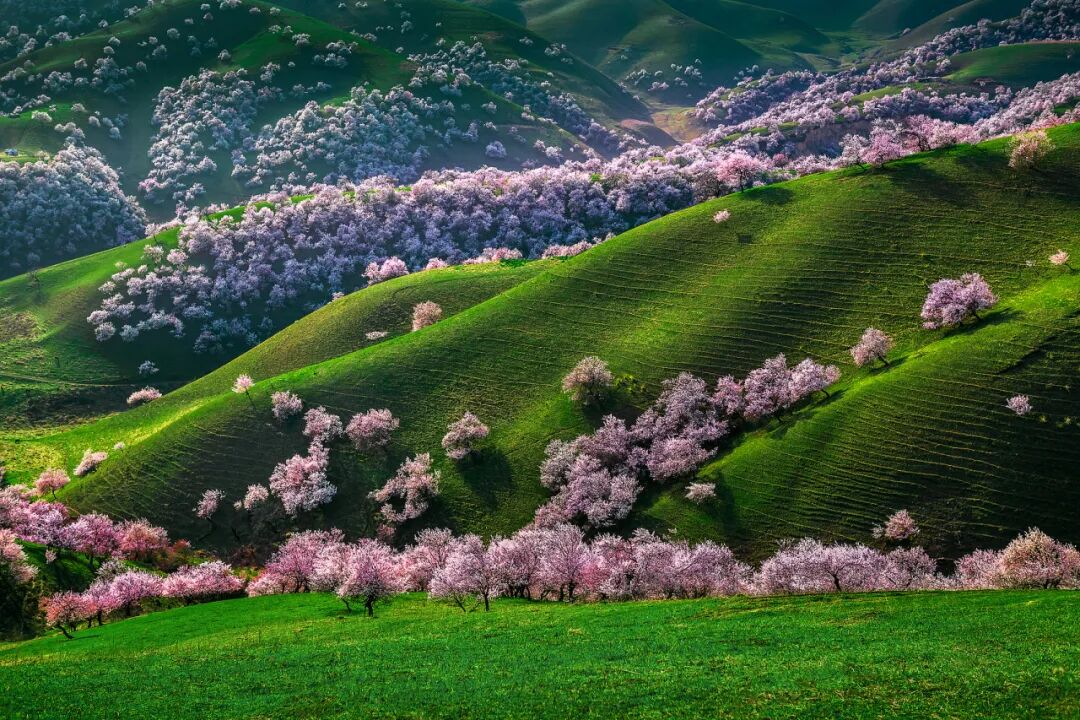 远处的天山山顶还有积雪,近处的草原刚冒出嫩绿的草芽,而杏花就在这冬与春的交界处,开得热热闹闹。风一吹,花瓣纷纷扬扬落下来,落在肩上,落在头发上,落在掌心里——这一刻您就明白了,为什么那么多人,千里迢迢就为来看这一场花。