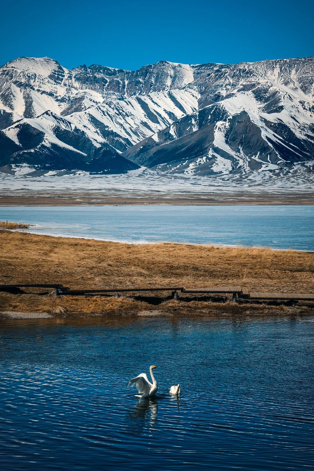 站在湖边,眼前是一望无际的蓝,耳边是湖水轻轻拍岸的声音,远处的雪山还戴着白色的帽子。
