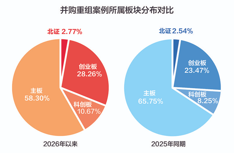 硬科技领域是2026年并购重组的主战场。分板块来看,主板企业并购数量仍占据绝对优势,交易数量占比约58.3%,但相比上一年降低超7个百分点,反映出传统行业并购从“规模扩张”向“精益整合”的转型趋势;代表硬科技领域的双创板块(创业板 科创板)合计占比增至近38.9%,较去年同期提升约7个百分点,逐步成为并购市场的主力;北交所占比2.77%,较上一年同期略微提升,其“专精特新”定位与中小市值科技企业特性,为并购市场提供了差异化补充。整体而言,双创板块并购的加速正在改变A股生态,半导体、人工智能、生物医药等硬科技细分领域并购活跃度显著提升。