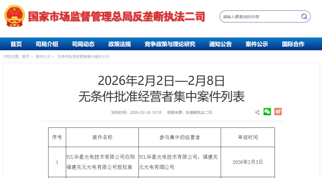 2月26日,国家市场监督管理总局发布《2026年2月2日-2月8日无条件批准经营者集中案件列表》,其中TCL华星光电收购福建兆元光电有限公司股权案位列其中,意味着该交易已正式通过反垄断审查。