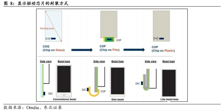 显示驱动芯片的封装方式:按封装形式区分,DDIC可以分为COG(Chip On Glass)、COF(Chip On Flex或Chip On Film)、COP(Chip On Plastic)等。COG是将DDIC封装在屏幕玻璃表面上,该技术成本低、良率高,但是边框较宽。COF是将DDIC 封装在屏幕和主板之间的FPC排线上,该技术可以实现“超窄边框”的效果。COP仅适用于OLED屏幕,该技术通过可弯折塑料基材连接DDIC和FPC,从而实现“无边框”的效果。