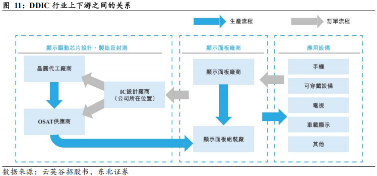 在显示驱动芯片产业链中,显示面板厂商通常向显示驱动芯片设计厂商提供设计需求。IC设计完成后,显示驱动芯片设计厂商向晶圆代工厂和OSAT供应商下达生产订单。晶圆代工厂将制造好的晶圆成品交给开展封装及最终测试流程的供应商。完整的显示驱动芯片再直接运给显示面板或模组厂商。后续由这些面板厂商将组装好的显示面板提供给各类终端应用。