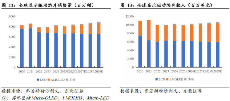 全球DDIC市场正从规模扩张转向价值重构,需求呈现显著结构性增长:2024年OLED DDIC出货量接近13亿颗,同比增长超24%,AMOLED智能手机DDIC需求量增至8.94亿颗,OLED在智能手机面板市场渗透率首超LCD;动力方面,智能手机高刷新率、折叠屏升级推动价值量提升,平板、笔电等IT产品用OLED DDIC 2024-2026年保持高速增长,车载显示受益智能座舱多屏化趋势,2026年销售额占比持续走高,Mini/Micro LED技术更催生新的增量市场。