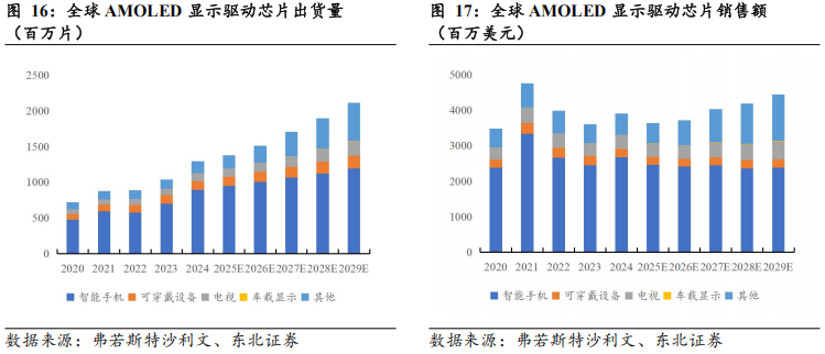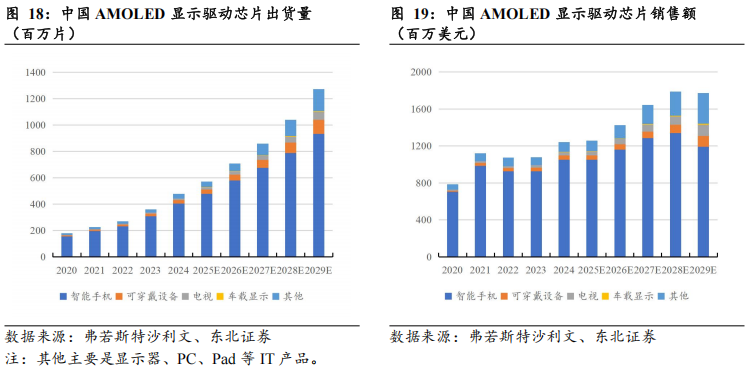 以下游应用来看,智能手机仍为AMOLED显示驱动芯片需求的主导驱动因素,中国大陆智能手机AMOLED显示销售量将以18.2%的复合增长率增长,到2029年将占全球出货量的78.3%。