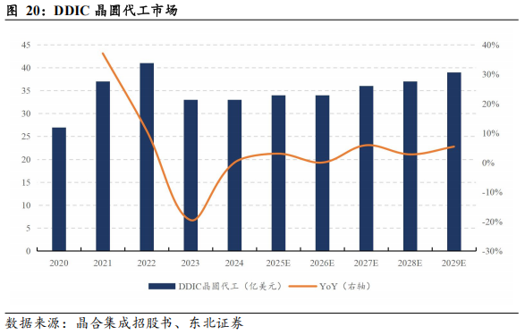 DDIC的全球晶圆代工市场规模从2020年的约27亿美金增加至2024年的33亿美金,年化复合增长率为5.1%。2021至2022年,受全球芯片产能紧缺及显示面板需求上升的影响,DDIC一度供应紧张,价格维持上涨。尤其伴随远程办公与在线教育带来的IT类显示面板需求增长,叠加驱动芯片制造所需成熟制程产能能分配紧张,行业整体处于供不应求状态。进入2023年后,随着晶圆厂产能逐步释放以及消费电子需求回归常态,显示驱动芯片供应压力缓解,价格随之回落至合理区间,市场规模出现一定回调。预计到2029年,全球DDIC代工市场将会达到39亿美元,2025~2029年化复合增长率为3.5%。