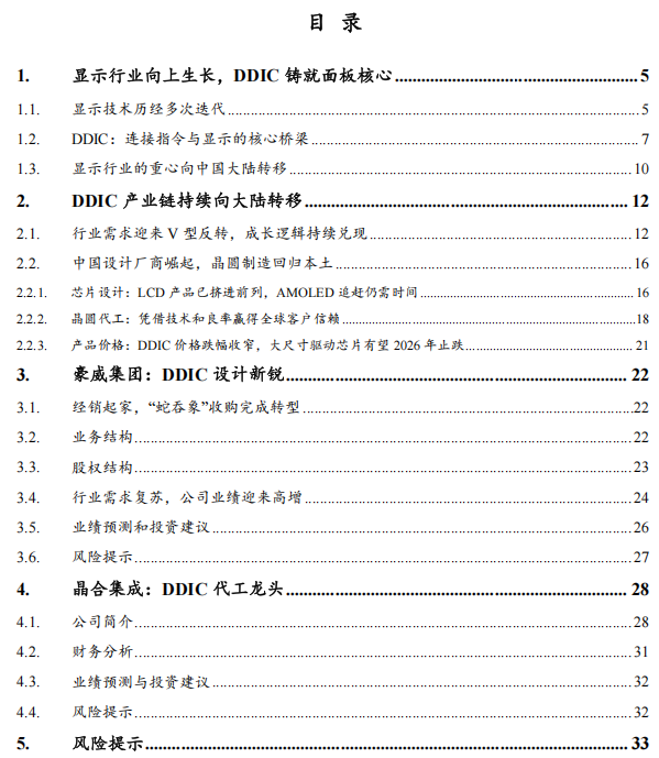 投资建议:中国显示行业崛起必将带动上游DDIC产业向中国大陆转移,我们非常看好DDIC设计新锐豪威集团,LCD TDDI已占据行业主流地位,AMOLED DDIC处于放量早期。同时也非常看好DDIC代工龙头晶合集成,随着新的产能释放和产品结构进一步优化,未来成长空间有望进一步打开。