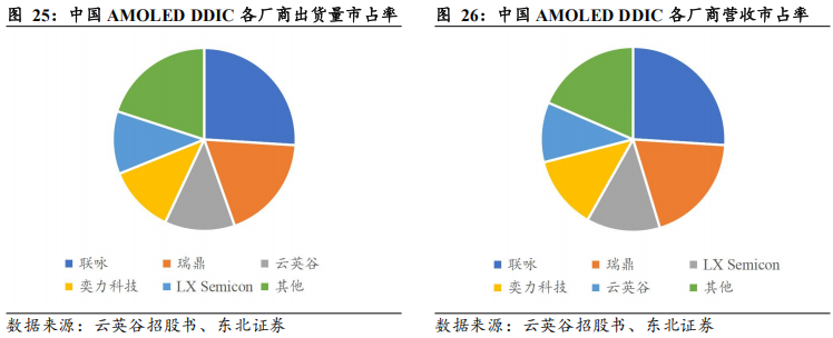 台系厂商联咏、瑞鼎为大陆面板厂核心供应商,联咏率先实现OLED TDDI在小米手机量产,2025H1在中高端AMOLED DDIC市场份额维持35%左右,但面临大陆厂商的成本竞争压力。