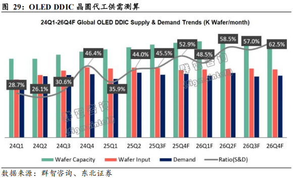 群智咨询(Sigmaintell)预计,2026年全球HV产能利用率将降至70%左右。得益于手机、平板、笔电、穿戴等应用的需求,OLED DDIC市场规模仍将继续呈现增长趋势。而供应方面,由于40/28HV制程门槛较高,二线代工厂新布局的产能集中在55/90HV制程。因此,相对而言OLED DDIC市场供需情况较为积极。预计2025年OLED DDIC晶圆(仅28/40HV,不含55HV)供应量约为10.8万片/月,需求量预计为8.7万片/月,供需整体偏好。