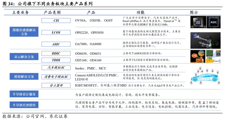 公司主营业务分为:半导体设计销售、半导体设计技术服务以及半导体代理销售三大板块。其中公司半导体设计业务主要由图像传感器解决方案、显示解决方案和模拟解决方案三大业务体系构成。