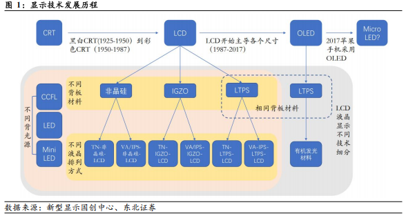 显示技术作为信息产业的重要组成部分,大到电视机、笔记本,小到手机、平板,都离不开显示技术的支持。显示技术从20世纪50年代的CRT技术,到90年代CRT、PDP、LCD技术并行;2000年后随着LCD技术的完善及相关优势,LCD成为显示技术的主流;