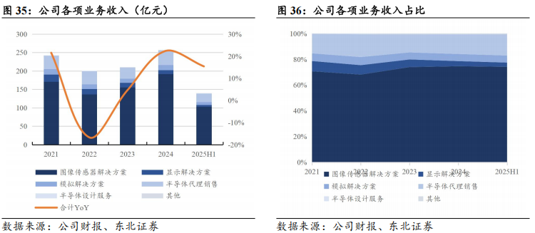 图像传感器解决方案是拳头产品。2024年公司半导体设计业务中,图像传感器解决方案业务实现营业收入191.90亿元,占主营业务收入的比例为74.76%,较上年增加23.52%;公司显示解决方案业务实现营业收入10.28亿元,占主营业务收入的比例为4.01%,较上年减少17.77%;公司模拟解决方案业务实现营业收入14.22亿元,占主营业务收入的比例5.54%,较上年增加23.18%。
