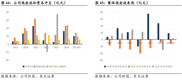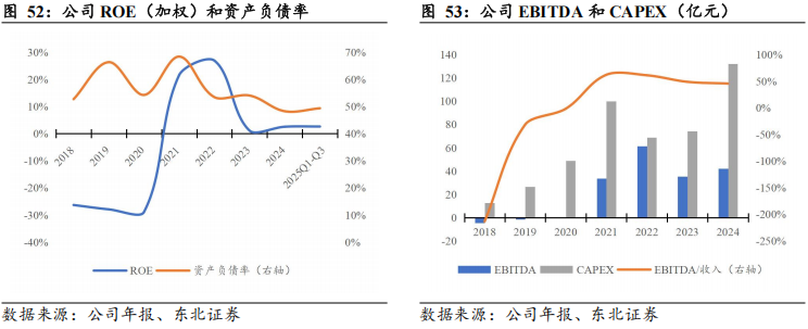 公司正处于“扩产投入-产能释放-盈利改善”的关键周期,四大指标呈现出CAPEX持续高强度、资产负债率温和下降、ROE稳步回升、EBITDA逐步修复的良好态势。随着2025年底三期项目满产与2026年四期项目投产,预计ROE与EBITDA将进入新一轮增长周期,而资产负债率有望维持在50%以下的合理区间。