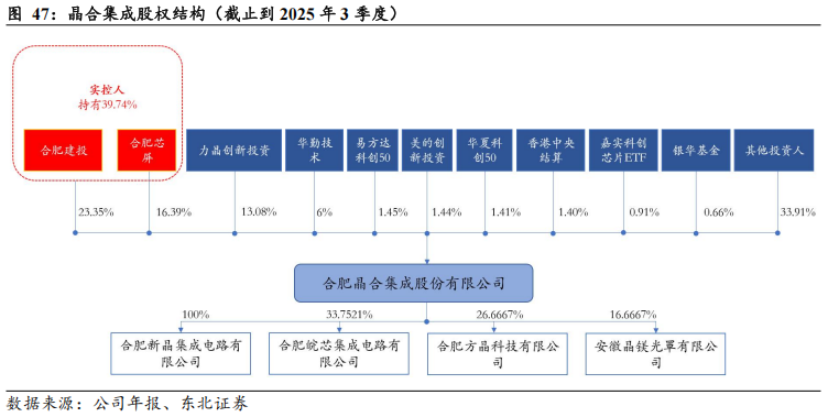 股权结构:晶合集成2025年三季度末普通股股东总数5.97万户,股权以国资为主导且头部集中度较高,合肥市国资委为实际控制人。前三大股东分别为合肥建投(23.35%)、合肥芯屏产业基金(16.39%)、力晶创新投资(13.08%),其中合肥建投与合肥芯屏为一致行动人。华勤技术以6%持股位列第四,为本期新进5%以上股东。公司回购专户持股3.09%,前十大股东中还有多家科创、芯片主题ETF及香港中央结算公司等机构,其余股东持股均低于2%。