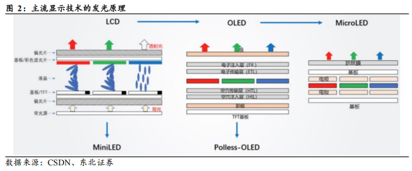 LCD利用外部光源(背光模组)发光,外加电场可以控制液晶层的偏转方向,进而影响光的偏转方向,白光穿过滤光片和偏光片后实现单个像素组(RGB)的颜色。LCD是目前最主流的显示技术之一。LCD在C端五大主流产品(TV、显示器、PC、Pad、手机)出货上占据90%的显示面积。