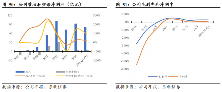 2024年净利率为5.21%,盈利水平处于行业中等区间。2025年前三季度归母净利润5.5亿元,同比大幅增长97.24%,Q3单季净利润2.18亿元,同比增幅达137.18%。但需注意,利润高增含1.52亿元技术转让一次性收益,扣非后Q3净利仅0.24亿元,同比下滑71.68%,反映研发投入增加(Q3研发费3.84亿元,增20.9%)及成本上升的压力。毛利率方面,2024年为25.5%,2025年前三季度微升至25.9%,Q3单季达26.13%,环比提升1.82个百分点,规模效应逐步显现。净利率受非经常性损益影响稍显波动,2025年前三季度为4.86%,同比上升0.49个百分点,Q3单季回升至5.58%,核心经营利润率仍待改善。