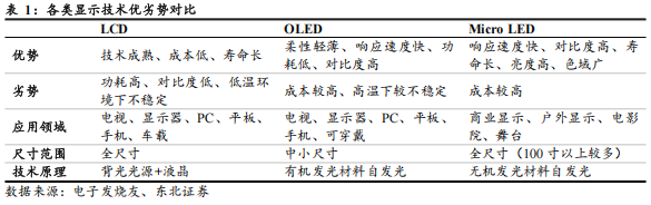 Micro LED 因为芯片尺寸较小、集成度高、自发光的特点,与LCD和OLED相比,在亮度、分辨率、对比度、能耗、使用寿命、响应速度和热稳定性等方面具有更大的优势。但是Micro LED因为巨量转移技术不够成熟,成本限制了技术的发展速度。
