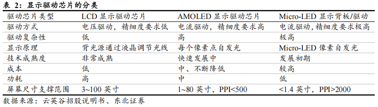 主流的显示驱动芯片主要包括LCD显示驱动芯片和AMOLED显示驱动芯片,此外,Micro LED显示背板/驱动通过与CMOS工艺的深度整合,近年来良率实现较快提升,其发展也非常迅速。