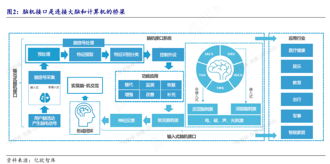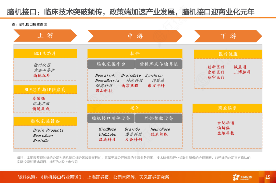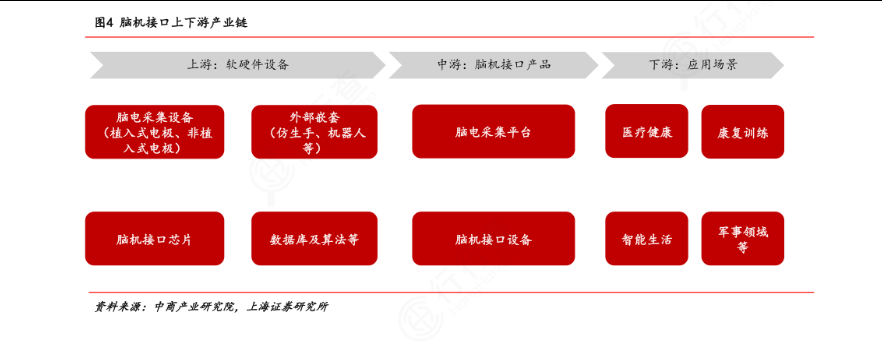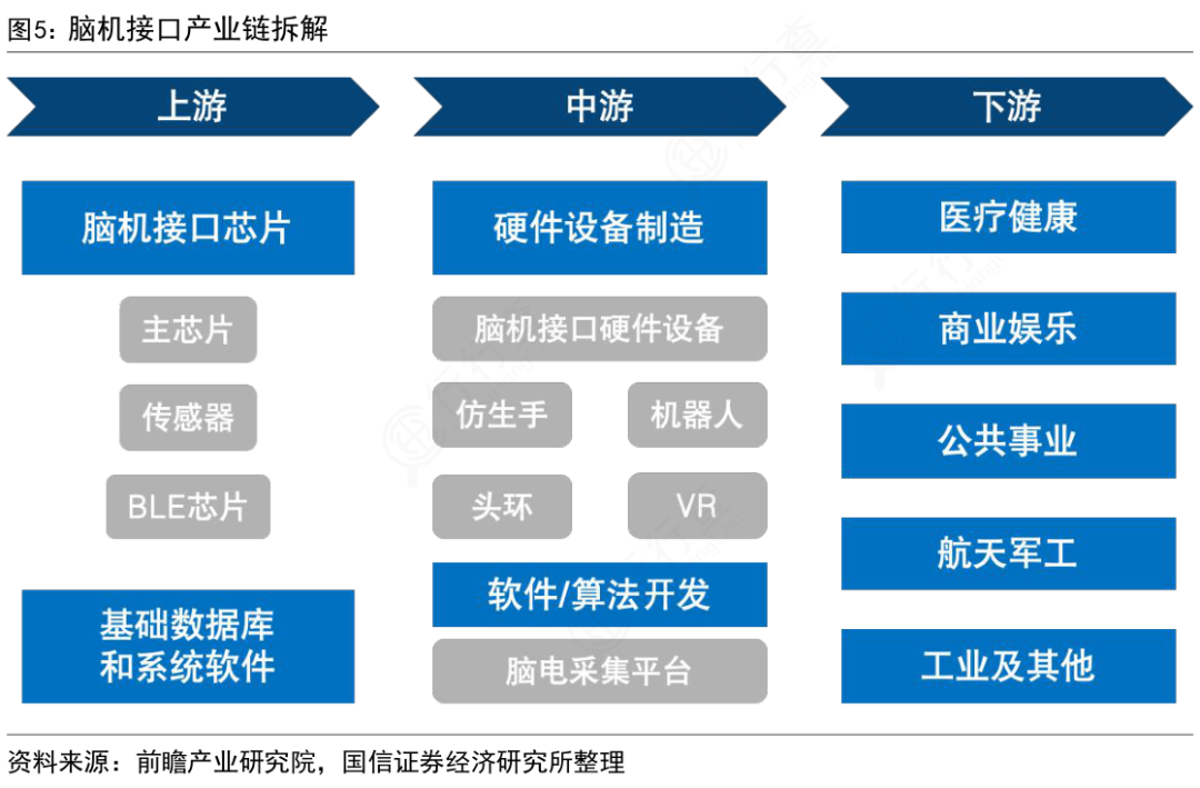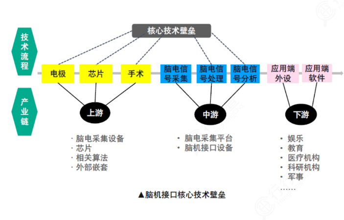 脑机接口产业链可分为上游、中游和下游三个主要环节。