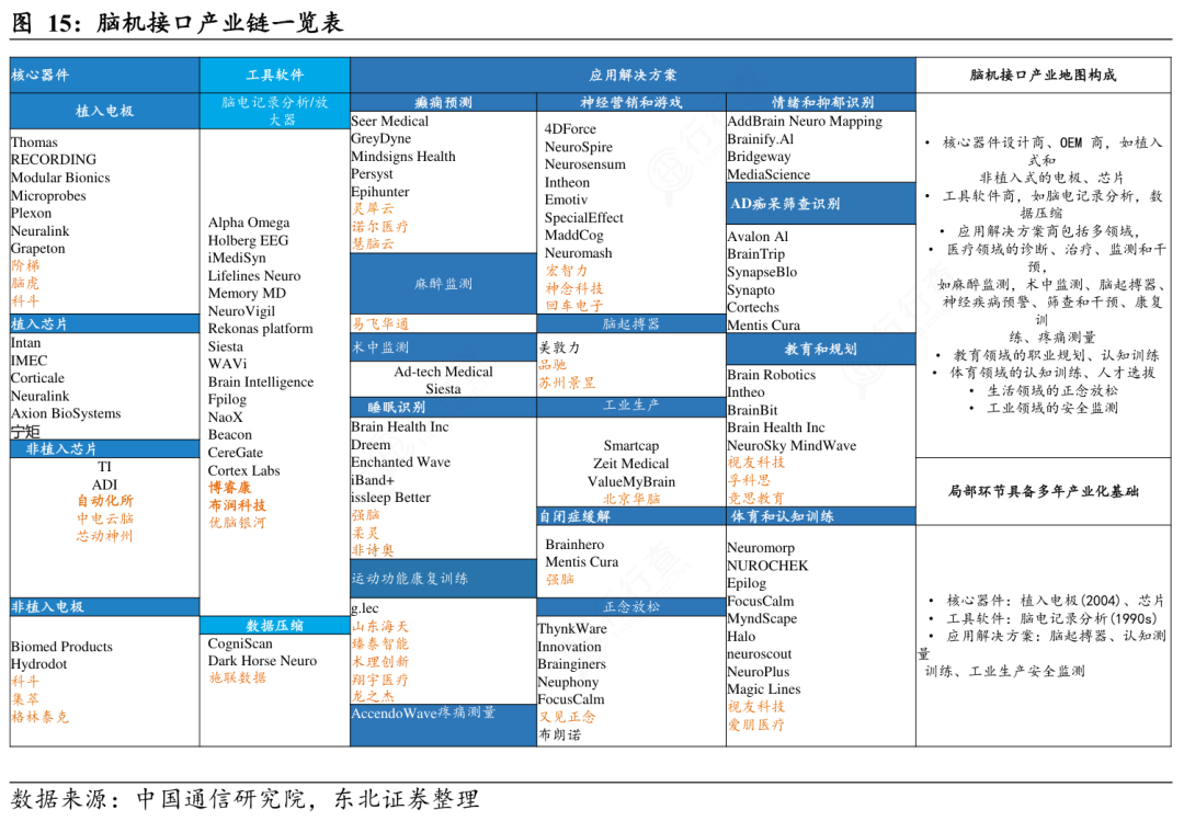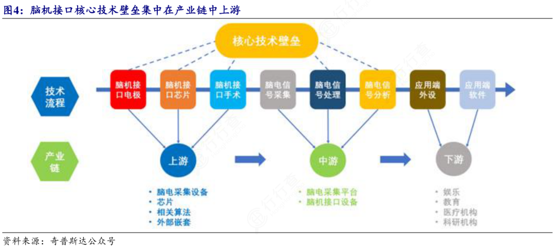 上游是整个产业链的技术基石,主要包括脑电采集设备、芯片、外部嵌套以及相关算法等核心组成部分。