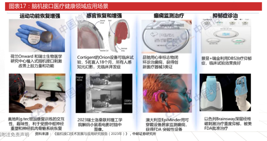 在医疗健康领域,脑机接口技术被广泛应用于疾病预警、诊断、治疗和功能增强等方面,面向的疾病包括:癫痫、帕金森、抑郁、疼痛、多动症、自闭症截瘫、卒中、阿尔兹海默症、意识障碍、耳鸣和听力受损、视力受损和睡眠障碍等。