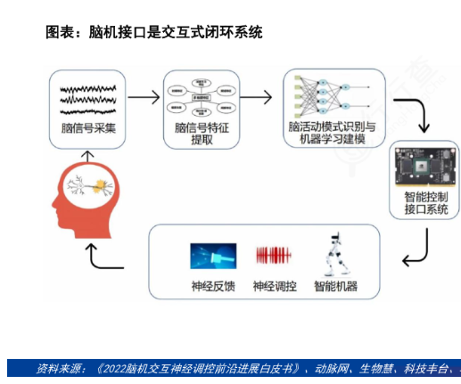 脑机接口系统由七大关键部分组成:大脑、脑信号采集、脑信号预处理、信号解析、控制接口、外部控制设备和神经反馈,形成一个闭环结构。外部设备可以是不同类型的计算机或机械装置,例如:笔记本电脑、脑起搏器、轮椅、假肢等。