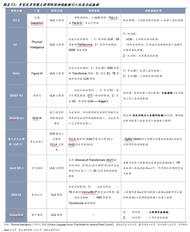 一般而言,真机数据的优势在于其高保真度(物理交互的真实性),能够精准反映复杂操作中的力学反馈和不确定性,劣势在于采集成本高昂、采集周期长且现阶段数量较少。仿真合成数据的优势在于低成本、高效率与场景的可扩展性,基于物理引擎可快速生成海量的多样化数据,尤其适合预训练数据积累与极端场景的模拟,劣势在于“仿真鸿沟”——虚拟环境与物理现实的偏差导致模型在真实任务中表现不稳定。目前,英伟达、Skild AI、银河通用三家厂商已明确在训练具身智能大模型时采用了仿真合成数据。