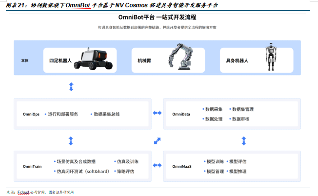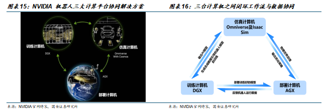 NVIDIA CEO黄仁勋于2025年CES大会上指出,每家机器人公司最终都必须构建三台基础计算机协同的解决方案,形成从训练到优化再到执行的完整体系。对于英伟达而言,“第一台计算机”是DGX AI超级计算机,用于训练。“第二台计算机”是基于NVIDIA RTX PRO服务器的NVIDIA Omniverse和Cosmos,用于生成合成数据、进行强化学习,同时也是DGX和 AGX的桥梁。“第三台计算机”是NVIDIA为边缘计算和自主系统设计的嵌入式平台NVIDIA Jetson AGX Thor,用于端侧部署。从训练到仿真再到部署,“三台计算机”打造了英伟达在通用人形机器人的完整框架,可以缩短人形机器人的开发周期、降低开发成本和风险,构建开放的生态系统。